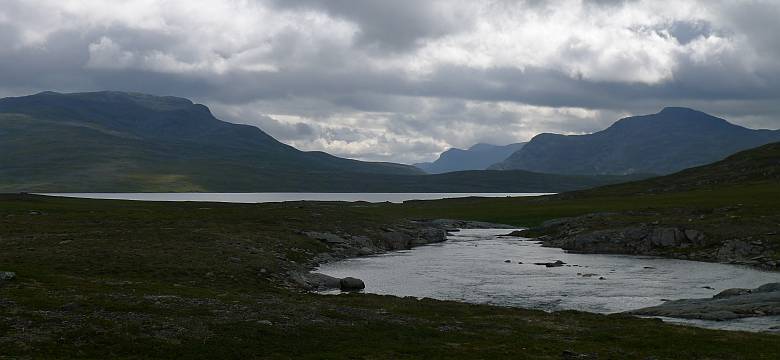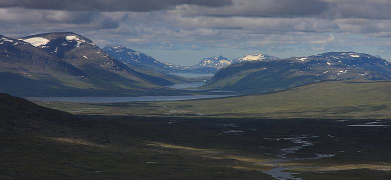 Från dagens högsta passpunkt får jag fin utsikt över ett pärlband av sjöar bort mot Norska kustfjäll.