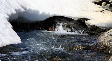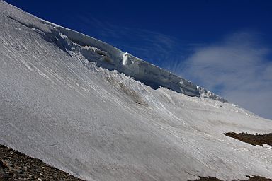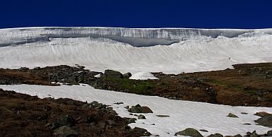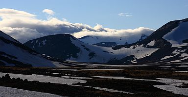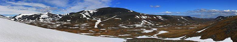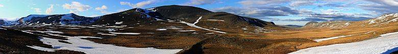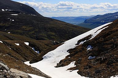 Terrängen går snart över till lättvandrad gräshed med snöfält här och där att korsa. |