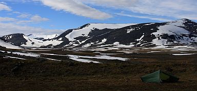 Väljer en tältplats med lite vindskydd eftersom det ser ut att komma en molnfront västerifrån. Det blir dock inte så mycket oväder förutom lite friskare vind framåt senkvällen.