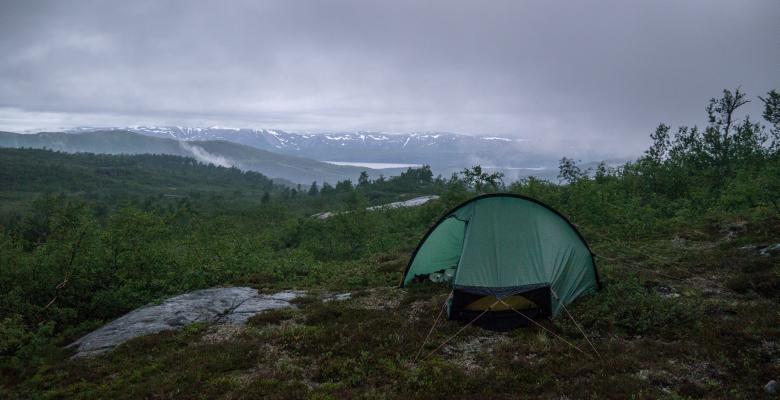 Efter en lång dags tågresande startar jag i Majavatn och vandrar drygt en timme tills jag kommit upp på kalfjället och kan slå läger vid foten av Kuklumpen.