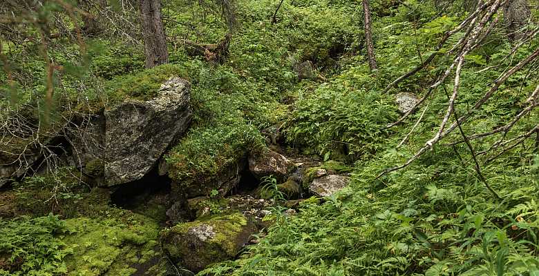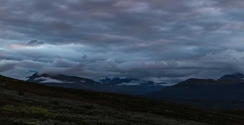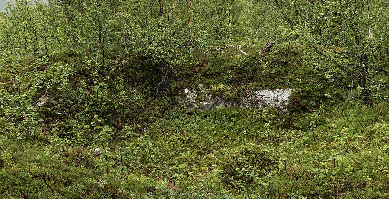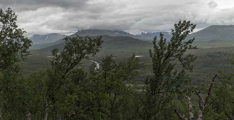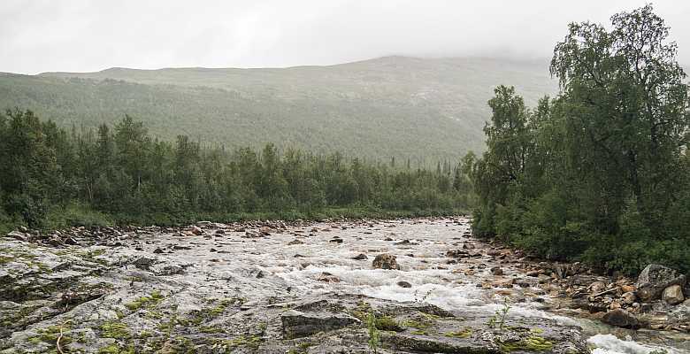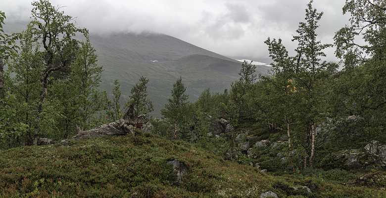 Betydligt molnigare idag. Jag packar ihop och vandrar ner i skogen mot Tjouldajåhkå. Det börjar snart regna lätt, men skogen är grön, lummig och riktigt härlig trots det tråkiga vädret.