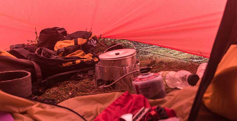 Det är inte utan att jag börjar undra hur jag ska hitta någon tältplats bland all denna sten. Jag har dock tur och finner en välanvänd plan yta framme vid Tjårokjávrre som förmodligen normalt utnyttjas av fiskare som flygs ut till denna otillgängliga plats med helikopter.