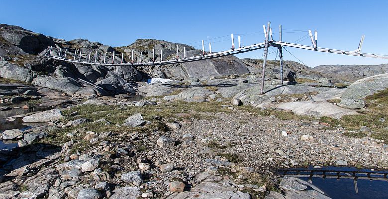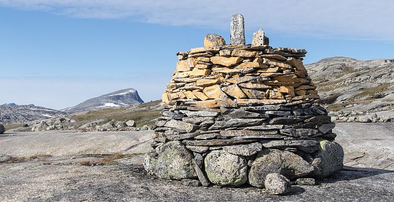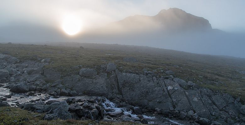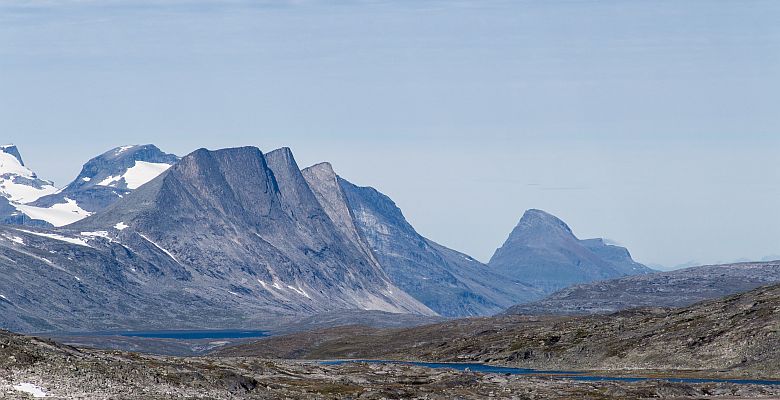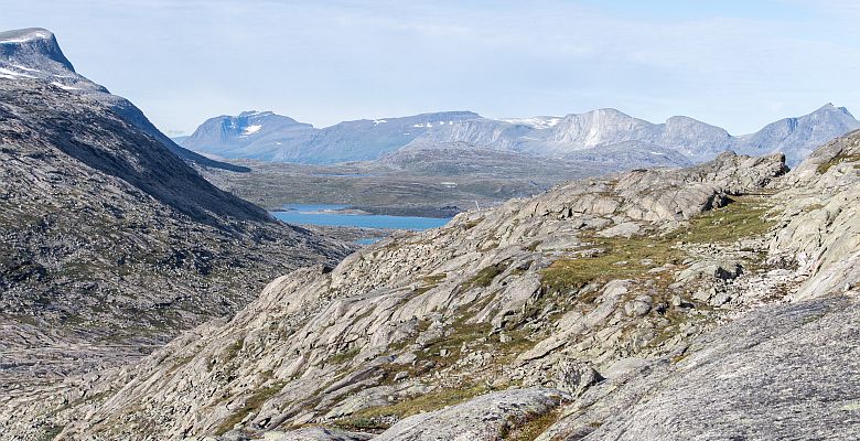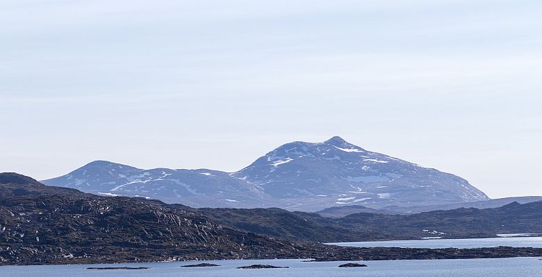 Bort mot Sverige så reser sig Sealggá högt över alla andra fjäll. På den här sidan gränsen tornar skarpa granitfjäll upp sig ut mot kusten.