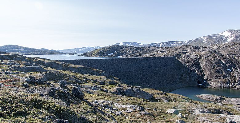 Passerar först den lilla överrinningsdammen, med en för dagen onödig bro, och lite senare den stora dammanläggningen.
