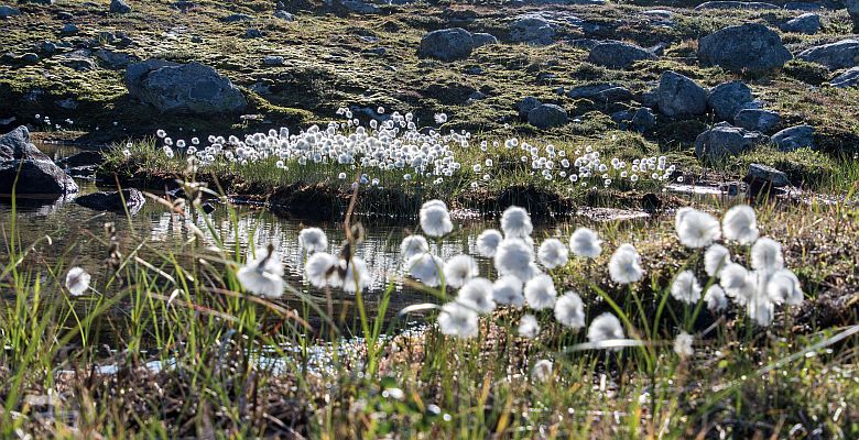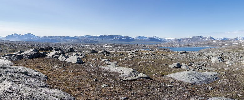Runt Skoaddejávri planar terrängen ut och utsikten sträcker sig miltals söderut trots den ringa höjden.