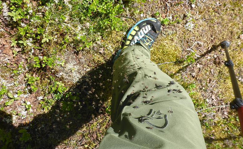 Jag viker av från stora vägen upp mot Helgmålshögen och möts av en veritabel knottinvasion - trots heltäckande kläder och myggnät över ansiktet så kommer jag inte undan utan blodvite.